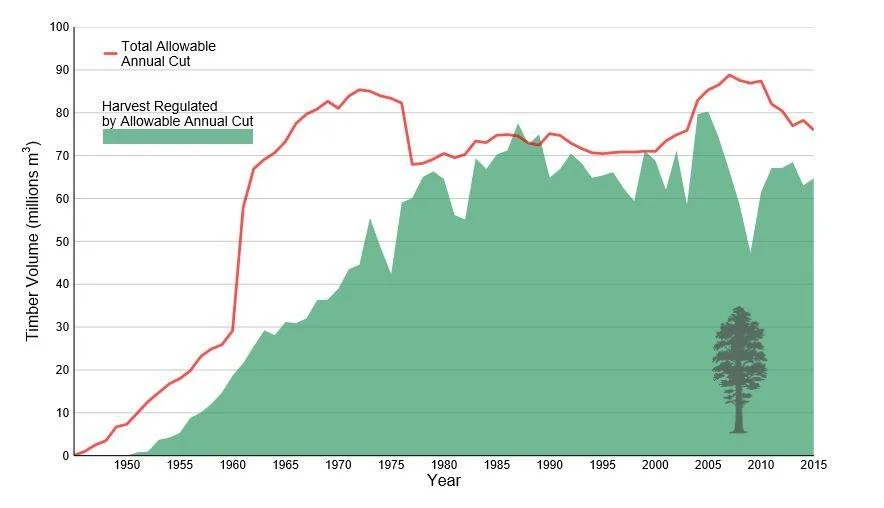 Figure 4 Annual Allowable Cut doubled in early 1960’s because of “close utilization” policy[5]